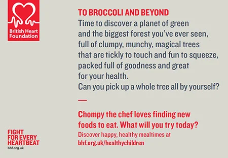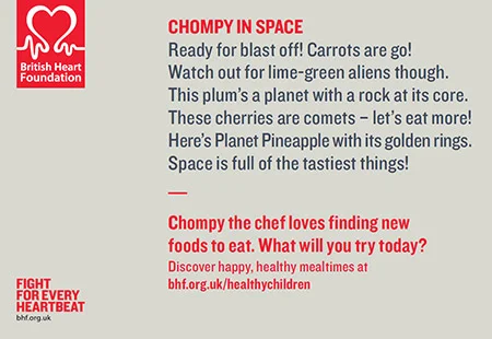 A British Heart Foundation pack to help parents make mealtimes fun and healthy for their young children. Based on the character of Chompy the chef, the pack includes a series of rhymes inspired by Chompy’s adventures in food. Design and concept by Magpie.